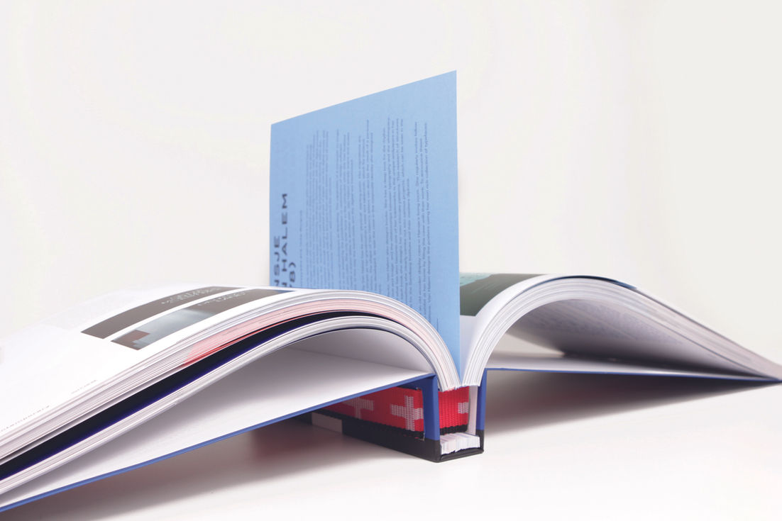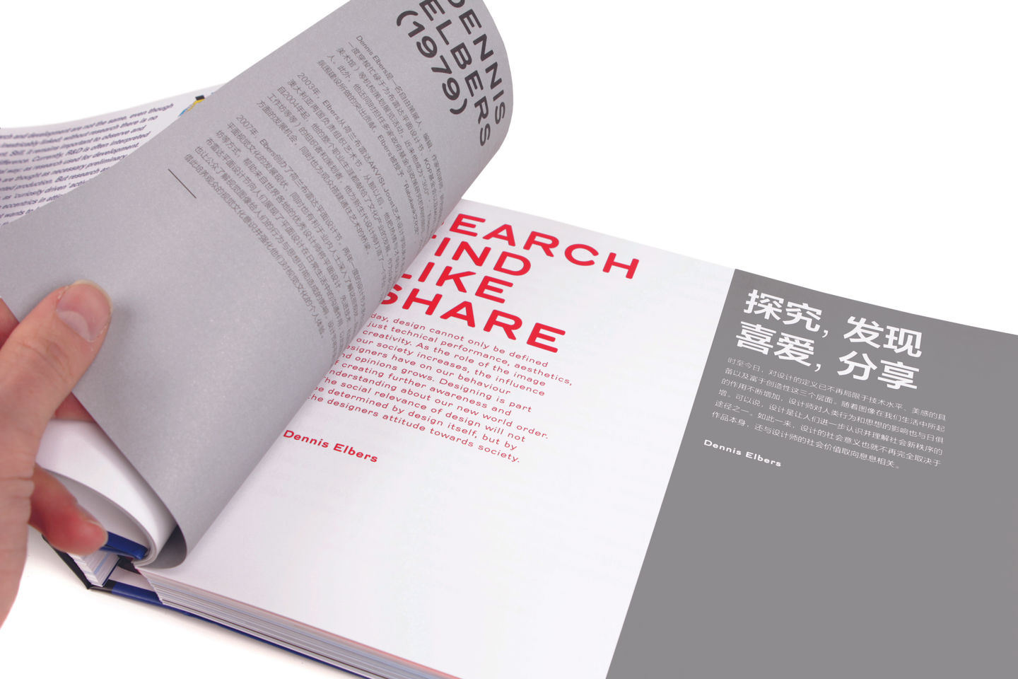 The logo is based on the Chinese symbol for "double happiness" and the red, white, and blue Dutch flag. It symbolizes the unity of both countries in design. The logo is divided into three bands that hold together all the flat-pack furniture pieces in the exhibition and bind the publication together. Thus, the logo literally and figuratively serves as the unifying factor within the entire design.